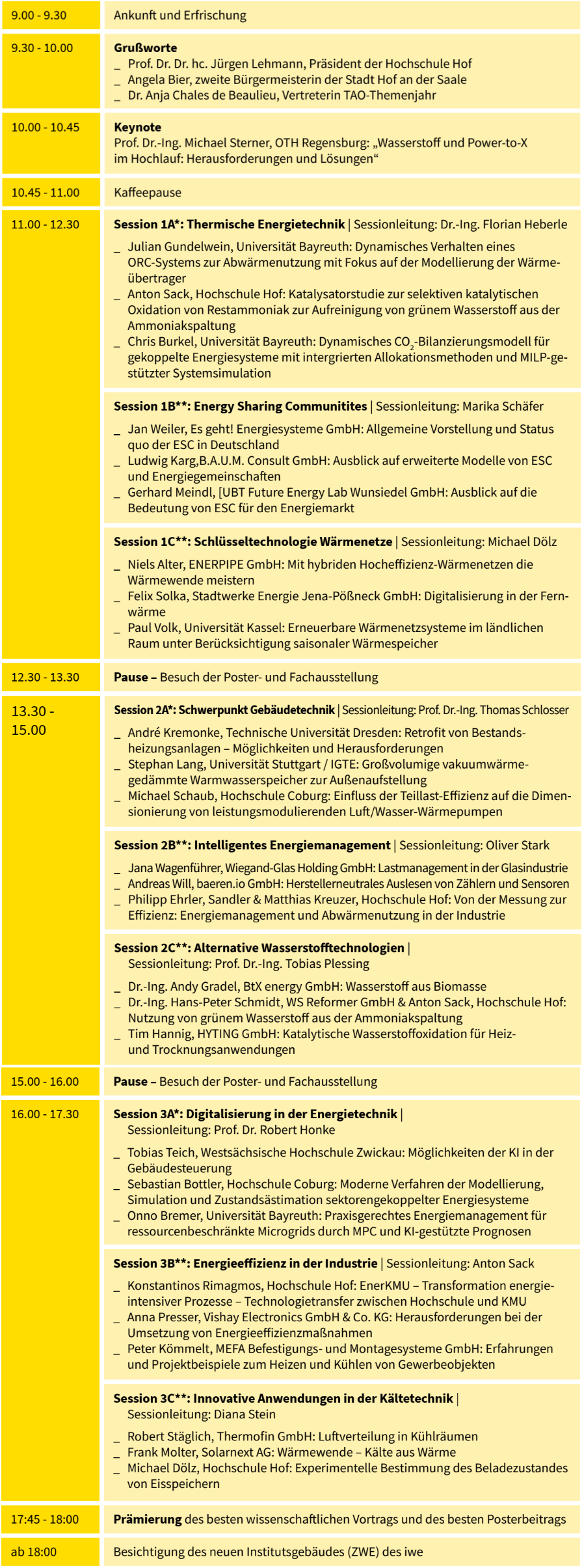 Erwarten Sie auch in diesem Jahr wieder spannende Vorträge zu verschiedenen Themenkomplexen der Energietechnik. Unser Programm umfasst eine Vielzahl von Sessions, darunter: